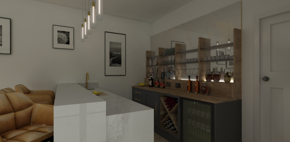An elegant bar, classily styled with a lit antique mirrored bottle & glass display, set behind a two tiered waterfalled quartz bar top.
