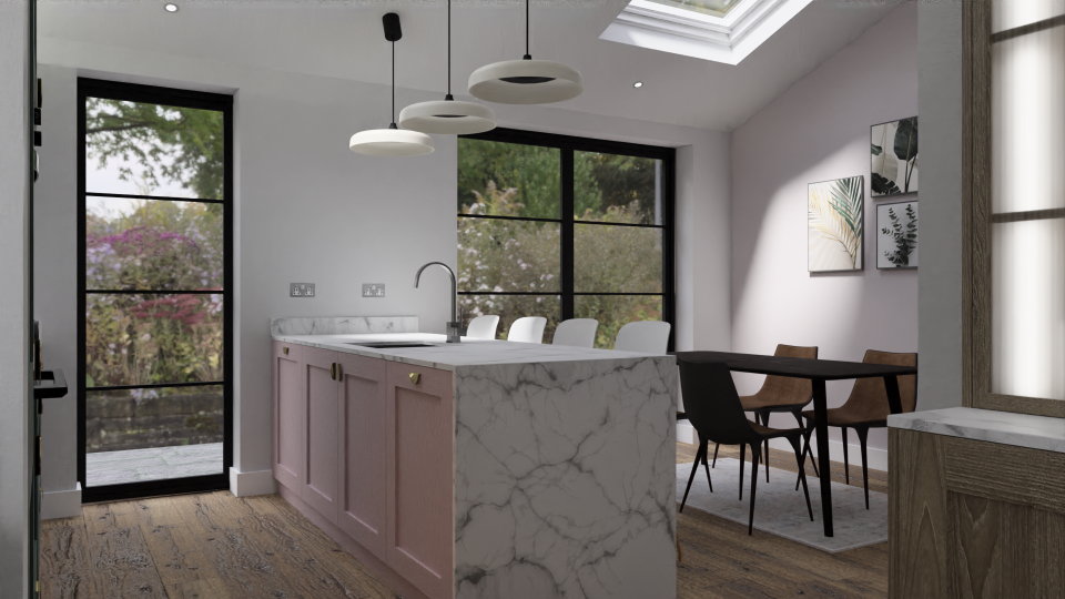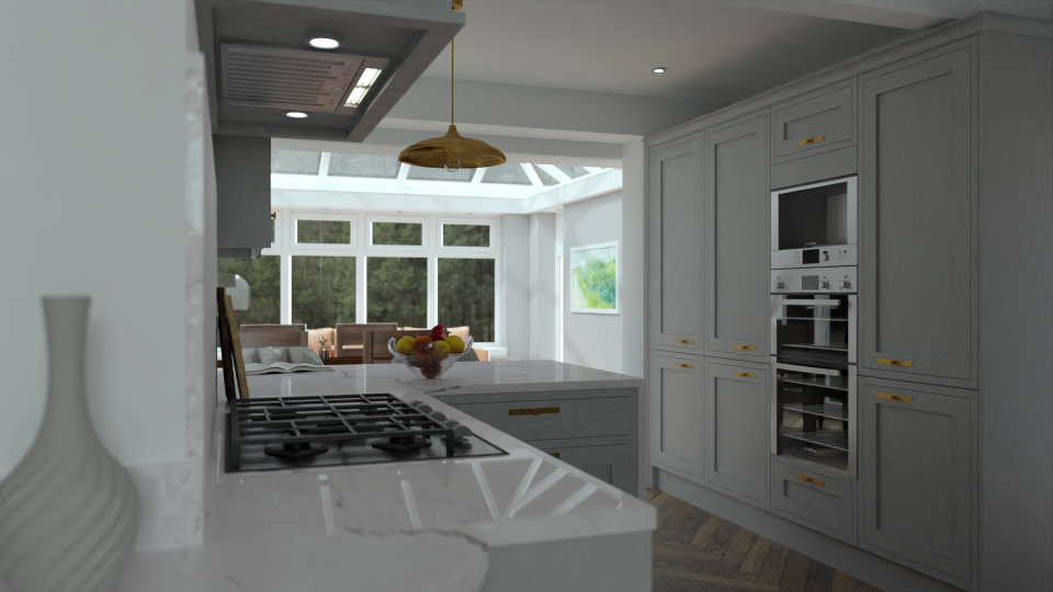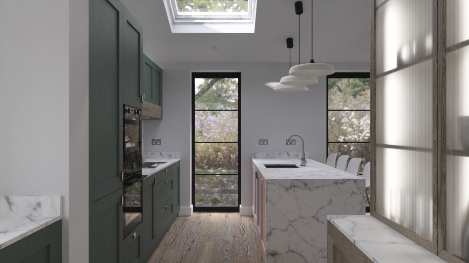 A big kitchen in a small space. 2 “L” shaped working areas separate cooking from cleaning, giving a breakfast peninsular with a waterfalled Calacatta marbled work surface.