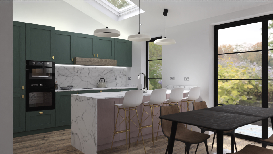 A mix of Vintage Pink & Deep Forest green painted shaker doors with mid century oak fluted glazed cabinets
